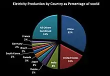 This is a list of countries by electricity generation per year, based on multiple sources. China is the world's largest electricity producing nation.