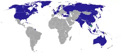 This is a list of diplomatic missions in Cambodia. At present, the capital city of Phnom Penh hosts 29 embassies and a delegation of the European Union. Several other countries have missions accredited from other capitals, mostly in Bangkok, Beijing, and Hanoi.