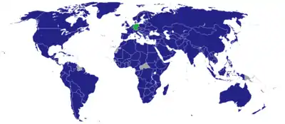| a. | ^ Kosovo is the subject of a territorial dispute between the Republic of Kosovo and the Republic of Serbia. The Republic of Kosovo unilaterally declared independence on 17 February 2008. Serbia continues to claim it as part of its own sovereign territory. The two governments began to normalise relations in 2013, as part of the 2013 Brussels Agreement. Kosovo is currently recognized as an independent state by 98 out of the 193 United Nations member states. In total, 113 UN member states recognized Kosovo at some point, of which 15 later withdrew their recognition. |