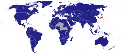 This is a list of diplomatic missions in Japan. At present, the capital city of Tokyo hosts 153 embassies. A few other countries are accredited through their embassies in Beijing or elsewhere. This listing excludes honorary consulates.