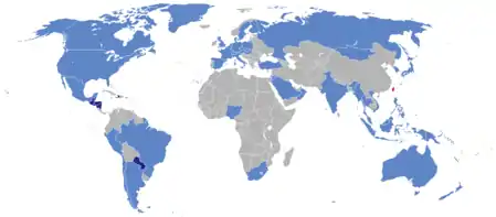 The diplomatic missions in Taiwan include embassies and representative offices. Due to the special political status and One-China policy, the Republic of China (Taiwan) is only recognized by 15 countries and Somaliland; all of them have an embassy in Taipei. In addition, approximately 50 countries, which do not have diplomatic relations with the Republic of China, have established trade offices and other unofficial offices in Taiwan, which have a wide array of titles.[1] However, due to opposition from People's Republic of China, the unofficial representative offices' titles do not have the word "Taiwan", except for unofficial representative offices from Oman, Japan, and the United States. [2] During the Japanese colonial period a number of countries including the Republic of China and the United States of America maintained consulates in Taipei.[3]