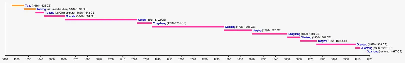 Like the emperors of the Ming dynasty, Qing monarchs used only one reign name and are usually known by that name, as when we speak of the "Qianlong Emperor" (r. 1735–1795) or the "Guangxu Emperor" (r. 1875–1908).[29] Strictly speaking, referring to the Qianlong Emperor simply as "Qianlong" is wrong, because "Qianlong" was not that emperor's own name but that of his reign era. For convenience sake, however, many historians still choose to call him Qianlong (though not "Emperor Qianlong").[30] The only Qing emperors who are not commonly known by their reign name are the first two: Nurhaci (r. 1616–1626), who is known by his personal name, and his son and successor Hong Taiji (r. 1626–1643), whose name was a title meaning "prince Hong". Hong Taiji was the only Qing emperor to use two era names (see table).[31]