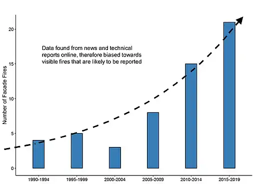 Plot showing the number of large facade fires worldwide every five years from 1990 to November 2019. Data found from news articles and online.[79][80]