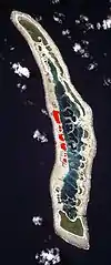 | Shark Islet | 80,000 m2 | Named for another shark encounter during the 1988 survey, this time along the beach, Shark Islet possesses Caroline's most notable sandy beach on its lagoon shore. Vegetation exists in concentric rings, rising to a Pisonia forest that covers about half the islet and provides abundant nesting venues for great frigatebirds and black noddies. | ![]() Shark Islet seen across the Caroline Island lagoon. | |