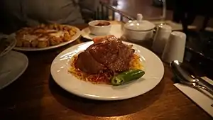 Chapli kebab A delicacy of Pakistan from Khyber Pakhtunkhwa province – marinated beef in spices and deep fried flat.[39] In Pakistan, it is sometimes deep fried in animal tallow, and it is a common kebab.[lower-alpha 1]