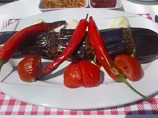 Patlıcan kebabı (aubergine kebab) A unique kebap meat marinated in spices and served with aubergines, hot pide bread and a yogurt sauce[48]