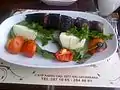 Beykoz kebabı Tomato and onion flavoured lamb, wrapped in aubergine slices and garnished with lamb brains[43]