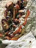 This is a list of kebab dishes from around the world. Kebabs are various cooked meat dishes, with their origins in Middle Eastern cuisine and the Muslim world. Although kebabs are often cooked on a skewer, many types of kebab are not.[1][2][3]