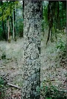 [ECU] Growing on bark of a Chestnut Oak along the Orange Trail between the Orange-Red-Yellow Trail intersection and the Orange-Yellow Trail intersection; N 39o24.692' W 076o49.510' Google Map (June 2003)