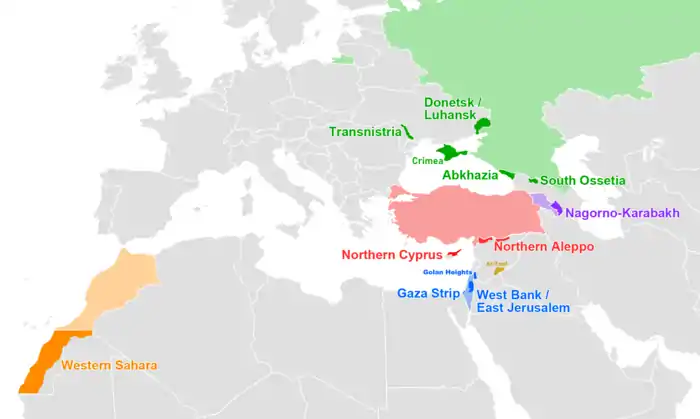 - Seized during the Western Sahara War; de facto annexed; administered as the Southern Provinces; claimed by the Sahrawi Arab Democratic Republic, a state with limited international recognition.