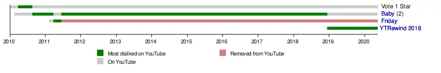 In March 2011, Baby, which then had 1.17 million dislikes, was surpassed by the video for Rebecca Black's Friday, yielding more than 1.2 million dislikes.[6] Friday amassed over three million dislikes before the video was taken down in June 2011. The video was reinstated three months later and has not been taken down since.[7]