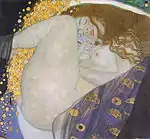 | 19 | ![]() | 1907–1908 – Danaë (oil on canvas, 77 cm x 83 cm) | Representation of the mythological daughter of King Acrisius of Argos and his wife Queen Eurydice. Danaë was a popular subject in the early 1900s for many artists; she was used as the quintessential symbol of divine love, and transcendence. While imprisoned by her father, King of Argos, in a tower of bronze, Danaë was visited by Zeus, symbolized here as the golden rain flowing between her legs. It is apparent from the subject's face and hands that she is aroused by the golden stream. In this work, she is curled in a sumptuous royal purple veil which refers to her imperial lineage.[8] Many early portrayals of Danaë were erotic; other paintings completed in similar style are Klimt's Medicine (1900– 1907), and No. 16, Water Snakes (1904–1907).[9] |