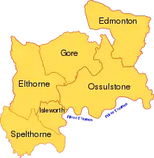 The historic county of Middlesex was recorded in the Domesday Book as being divided into the six hundreds of Edmonton, Elthorne, Gore, Hounslow (Isleworth in all later records),[1] Ossulstone and Spelthorne, as follows:
