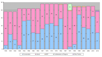 The chart on the upper right shows the information graphically, with the most recent elections towards the right. It shows that New Brunswick has effectively a two-party system – the Liberals (red) and the Conservatives (blue); along with the one-off success of the Confederation of Regions party (green) in 1991. It also shows the Liberal party's clean sweep of seats in 1987, one of the few instances in history when a party won all the seats in a national or sub-national legislature. Since provincial parties were officially recognised, the Liberal party have won eleven out of twenty elections.