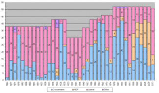 The chart on the upper right provides a graphical summary of the results, with the most recent elections towards the right. It shows how the Liberal party (red) dominated the province's early political history, winning nineteen of the first twenty-two elections from 1867 to 1953; and that since 1953, the Conservatives (blue) have been the most successful party, winning eleven of the fifteen elections since then. The New Democratic Party (orange), after winning Official Opposition status in four consecutive elections, finally achieved government for the first time in the 2009 election.