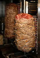 This is a list of notable spit-roasted foods, consisting of dishes and foods that are roasted on a rotisserie, or spit. Rotisserie is a style of roasting where meat is skewered on a spit, a long solid rod used to hold food while it is being cooked over a fire in a fireplace or over a campfire, or roasted in an oven. Spit-roasting typically involves the use of indirect heat, which usually cooks foods at a lower temperature compared to other roasting methods that use direct heat.[1] When cooking meats, the nature of the food constantly revolving on a spit also creates a self-basting process.[1] Spit roasting dates back to ancient times, and spit-roasted fowl and game "was common in ancient societies".[2][3]