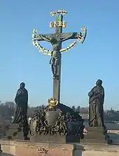 (sousoší Kříže s Kalvárií) This sculpture is one of the most historically interesting sculptures on the bridge, which gradually gained its present appearance throughout many centuries. The original wooden crucifix was installed at this place soon after 1361 and probably destroyed by the Hussites in 1419. A new crucifix with a wooden corpus was erected in 1629 but was severely damaged by the Swedes towards the end of the Thirty Years' War. The remnants of this crucifix can be found in the lapidarium of the National Museum in Prague. This was replaced by another wooden Calvary which, in turn, was replaced with a metal version in 1657. Bought in Dresden, this crucifix was originally made in 1629 by H. Hillger based upon a design by W. E. Brohn. In 1666, two lead figures were added, but these were replaced in 1861 by the present sandstone statues by Emanuel Max, portraying the Virgin Mary and John the Evangelist.