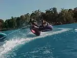 Tubing, also known as biscuiting, is where a large circular rubber tube is towed behind a boat at fast speeds. The general aim is to hold on as long as possible without falling off due to the boat's sharp turns; more experienced biscuiters also try to jump the boat's wake and become airborne.