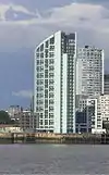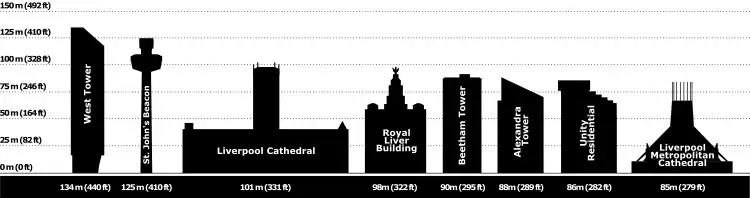 This list of the tallest buildings and structures in Liverpool ranks high-rise structures in Liverpool, England, by height (buildings in the wider Liverpool Urban Area are listed separately within the article). The tallest building in Liverpool is currently the 40-storey West Tower, which rises 134 metres (440 ft) on Liverpool's waterfront. It is also the tallest building in the United Kingdom outside of Manchester and London.[1] Liverpool is a city undergoing mass regeneration, with older buildings being demolished to make way for new developments. During the mid-2000s, ten 1960s apartment blocks over 50 metres (164 ft) tall in the city were demolished.[2]