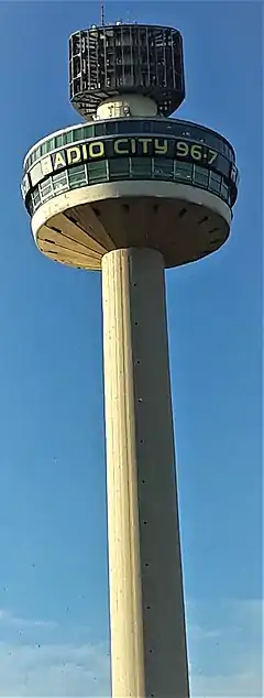 The history of tall buildings and structures in Liverpool began in 1911, with the completion of the Royal Liver Building. Standing at 98 metres (322 ft) tall,[3] it was widely reported to be Britain's first skyscraper.[4] This period marked the pinnacle of Liverpool's economic success, when it regarded itself as the "second city" of the British Empire.[5][6] In 1965, its 54-year reign as the tallest building in Liverpool came to an end with the completion of the Radio City Tower. At 125 metres (410 ft), it originally housed a revolving restaurant and then, since 2000, a radio station.[7] In 2008, the Radio City Tower was topped by Beetham Organization's West Tower.[8]