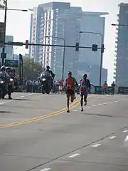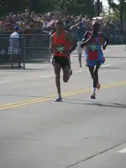 The first six pairs of races were swept by the United States.[5] Runners representing the United Kingdom won both races in 1996 (Paul Evans and Marian Sutton).[6] Kenya has been victorious in both races twice (1998 and 2001) and is the most recent country to do so, with representatives Ben Kimondiu and Catherine Ndereba.[5] Deena Kastor, the 2005 female winner, is the last victor from the host nation. Although four-time winner Khalid Khannouchi represented the United States during his 2000 and 2002 victories after becoming an American citizen,[7] the last American-born male winner prior to 2017 was Greg Meyer.[3][4] Galen Rupp became the first American-born male to win the race in 35 years with his 2017 victory.[8] 1979 winner Laura Michalek of the United States was just 15 years old.[2]