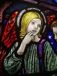 St Michael and All Angels | 1929 | A single light window depicts St Cecilia.[26]Commissioned by Mrs. Prentice to commemorate her daughter, Rachel, who died at age nineteen in March of 1919, depicts the angel, bending over to whisper in the ear of Saint Cecilia (patron saint of music). The lower panel is inscribed with a quote from Revelations (14.4): The first fruits unto God. |