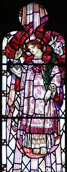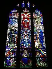 1909 and 1917 | The 1909 window is of three-lights. The lights left and right are of plain glass and in the centre light a standing figure of Mary holds lilies. The 1917 window is of four-lights. At the centre of the window the standing, crowned, figure of Christ blesses a soldier in armour, presented by an angel who crowns the soldier. The "new" Jerusalem is shown in the background. Below an angel greets the three women who visit the empty tomb. In the left-hand light a robed female figure holds a shield and broken sword with fire rising behind and castellated walls, with Christ on the cross above in a mandoria. The right-hand female figure stands with her arm chained, the flowers of a tree around her and the Virgin and Child above in a mandoria. Further angels appear in the tracery and rays of light emanate from the uppermost light.[14] Parsons also completed an opus sectile plaque for the church in 1919.[5] |