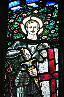1916 | Parsons completed a memorial window for this Manchester church remembering Norman Sawers Scott and his brother Ian Sawyers Scott, both killed in the Great War. Norman Sawers Scott was a second lieutenant in the 2nd Battalion of the King’s Own Scottish Borderers and was killed at Ypres on 23 April 1915. He was 20 years of age. His brother Ian Sawers Scott was also a second lieutenant in the 2nd Battalion King’s Own Scottish Borderers and was killed at the Battle of the Somme on 1 July 1916. He was 19 years of age. The window also remembers William Sawers Scott MD who died 31 January 1923 aged 62 years. On this window Parsons put his "parr and suns" emblem, not something he did often (a parr is a young salmon). The window is on the South wall of the Nave. It is a two-light window and between the lights is a Scottish officer’s sword mounted onto a stone mullion. Below the window there is an inscribed stone tablet. Each window depicts a knight in armour. The knight on the left holds a St George flag and the knight on the right holds a St George shield. The face of each knight is a likeness of the two brothers remembered[13] |
