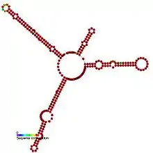 Listeria Hfq binding LhrA is a ncRNA that was identified by screening for RNA molecules which co-immunoprecipitated with the RNA chaperone Hfq.[1] This RNA is transcribed from a region overlapping with a predicted protein of unknown function (Lmo2257) and is located between a putative intracellular protease and a putative protein of the ribulose-phosphate 3 epimerase family. It is highly expressed in the stationary growth phase but the function is unknown. It is proposed to be a regulatory RNA which controls gene expression at the post transcriptional level by binding the target mRNA in an Hfq dependent fashion. This RNA molecule appears to be conserved amongst Listeria species but has not been identified in other bacterial species.