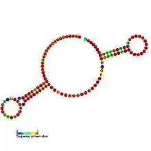Listeria LhrC ncRNA was identified by screening for RNA molecules which co-immunoprecipitated with the RNA chaperone Hfq.[1] However, neither the stability nor the activity of LhrC seem to depend on the presence of Hfq.[2][3] This RNA is transcribed from an intergenic region between the protein coding genes cysK, a putative cysteine synthase and sul, a putative dihydropteroate synthase. In Listeria monocytogenes four additional copies of lhrC have been identified in the genome, three of which are located in tandem repeat upstream of the originally characterised lhrC. This RNA molecule appears to be conserved amongst Listeria species but has not been identified in other bacterial species. It is involved in virulence.[2] The direct mRNA targets of LhrC are the virulence adhesion LapB, and the oligo-peptide binding protein OppA.[2][3] The 3 conserved UCCC motifs common to all copies of LhrC are involved in the mRNA binding and post-transcriptional repression of the target genes. Two other Listerina monocytogenes sRNAs Rli22 and Rli33 contain 2 UCCC motifs and use them to repress oppA mRNA expression.[4]
