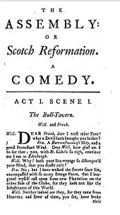 The loss of a royal court also meant there was no force to counter the Kirk's dislike of theatre, which struggled to survive in Scotland.[22] However, it was not entirely extinguished. The Kirk used theatre for its own purposes in schools and was slow to suppress popular folk dramas.[17] Surviving plays for the period include William Alexander's Monarchicke Tragedies, written just before his departure with the king for England in 1603. They were closet dramas, designed to be read rather than performed, and already indicate Alexander's preference for southern English over the Scots language.[19] There were some attempts to revive Scottish drama. In 1663 Edinburgh lawyer William Clerke wrote Marciano or the Discovery, a play about the restoration of a legitimate dynasty in Florence after many years of civil war. It was performed at the Tennis-Court Theatre at Holyrood Palace before the parliamentary high commissioner John Leslie, Earl of Rothes.[31] Thomas Sydsurf's Tarugo's Wiles or the Coffee House, was first performed in London in 1667 and then in Edinburgh the year after and drew on Spanish comedy.[32] A relative of Sydsurf, physician Archibald Pitcairne (1652–1713) wrote The Assembly or Scotch Reformation (1692), a ribald satire on the morals of the Presbyterian Kirk, circulating in manuscript, but not published until 1722, helping to secure the association between Jacobitism and professional drama that discouraged the creation of professional theatre.[33]