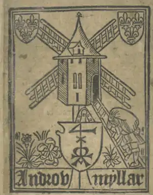 The establishment of a printing press under royal patent in 1507 would begin to make it easier to disseminate Scottish literature and was probably aimed at bolstering Scottish national identity.[6] The first Scottish press was established in Southgait in Edinburgh by the merchant Walter Chepman (c. 1473–c. 1528) and the bookseller Andrew Myllar (fl. 1505–08). Although the first press was relatively short lived, beside law codes and religious works, the press also produced editions of the work of Scottish makars before its demise, probably about 1510. The next recorded press was that of Thomas Davidson (f. 1532–42), the first in a long line of "king's printers", who also produced editions of works of the makars.[7]