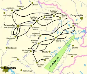 On May 18, the reorganized army carried out its first operation. The Vilkmergė Group captured Kurkliai and Anykščiai.[64] On May 22, the Group launched an attack on Utena. The initiative was met by a Soviet counterattack and the Lithuanian forces retreated. Further attacks were stopped for several days to wait for the results of the advance on Kupiškis.[65] The drive towards Utena resumed on May 31, and the city was secured on June 2. The Panevėžys Group launched a drive towards Panevėžys on May 18 and secured the city the following day, but lost it to a Bolshevik counterattack, carried out on May 21.[32] However, the Soviets left Panevėžys without a fight two days later.[66] The Group charged towards Kupiškis and secured Subačius. On May 30, Joniškėlis' partisans broke through the Soviet lines and took Rokiškis in Soviet rear;[67] Bolshevik forces, afraid that they could be encircled, left Kupiškis on the night of May 30–31, and Lithuania secured that city on June 1.[68]