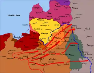Red Army captured one town after another: Zarasai and Švenčionys (Dec. 22), Utena (Dec. 23), Rokiškis (Dec. 27), Vilnius (Jan. 5), Ukmergė and Panevėžys (Jan. 9), Šiauliai (Jan. 15), Telšiai (Jan. 25).[30] That accounted for about 2⁄3 of the Lithuanian territory. The front somewhat stabilized when Soviet forces were stopped near the Venta River by Latvian and German units (Baltische Landeswehr).[33] Also, Germans slowed down withdrawal of their troops after the Spartacist uprising was subdued on January 12.[34] Southern Lithuania was a little better protected as Germans retreated from Ukraine through Hrodna. To prevent fights between retreating Germans and the Red Army, the Soviets and Germans signed a treaty on January 18. The treaty drew a temporary demarcation line that went through Daugai, Stakliškės, and 10 kilometres (6.2 mi) east of the Kaišiadorys–Jonava–Kėdainiai railway.[35] That barred Bolshevik forces from directly attacking Kaunas, Lithuania's second-largest city. The Red Army would need to encircle Kaunas and attack through Alytus or Kėdainiai. The operation to take Kaunas began on February 7.