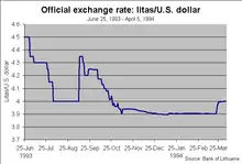 The litas was established at a value of 10 litų = 1 US dollar and was subdivided into 100-centų. In the face of worldwide economic depression, the litas appeared to be quite a strong and stable currency, reflecting the negligible influence of the depression on the Lithuanian economy. One litas was covered by 0.150462 grams of gold stored by the Bank of Lithuania in foreign countries. In March 1923, the circulation amounted to 39,412,984 litas, backed by 15,738,964 in actual gold and by 24,000,000 in high exchange securities.[3] It was required that at least one third of the total circulation would be covered by gold and the rest by other assets. By 1938, 1 U.S. dollar was worth about 5.9 litai,[4] falling to about 20 U.S. cents before its disappearance in 1941.[5]