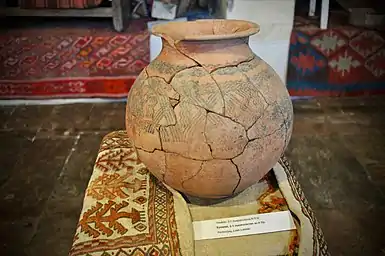 Of particular significance is the five-faced idol, which dates back to the 2nd millennium B.C. It is a special pre-Christian object that demonstrates a unique type of imagery.[3] It was found between Tatev and Goris (Harzhis village), and its excavation suggested the location of a pagan temple that existed there previously. Another significant work exhibited at the Museum is the bronze lion from the 7th century B.C. (the Urartian period), symbolic of the Urartian kings.[4]