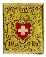 The local mail and rayon stamps of 1850 and 1852 constituted the first series of postage stamps issued by the Swiss Post. In philately, they are among the most sought-after Swiss stamps, with a 5 rappen Rayon I stamp selling for the record price of CHF 348,000 (USD 293,000) at auction in 2008.[1]