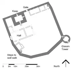 The castle comprises a rectangular courtyard surrounded by a curtain wall, with a tower house, or keep, at one corner, and the round Glassin Tower projecting from the opposite corner. The foundations of demolished ranges of buildings remain around two sides of the courtyard. Of the outer court, only an earth bank shows the position of the walls, with fragmentary remains of a bakehouse the only visible structures.