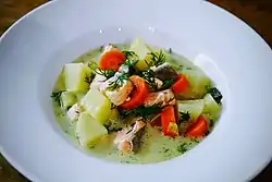 Creamy salmon soup (lohikeitto in Finnish, laxsoppa in Swedish) is a common dish in Finland and other Nordic countries. It consists of salmon fillets, boiled potatoes and leeks.[1][2] The soup is served hot, with some dill. There is a discussion about the ingredients of the dish, whether milk should be used as an ingredient.[2] Milk may be substituted for cream, however it must be whole milk.