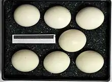 Egg-laying is between normally between late March and early May in most of the range. Egg laying dates in the northeastern United States, in a sample of 42 eggs, were between March 14 and May 30. Additional records in southern Canada show laying as occurring at as late as June 5.[8][81] 43 eggs in Ontario were laid between March 19 to May 24, more than half between April 15 and May 5.[79] In northern Italy, the mean egg laying date was March 27.[229] Exceptional eggs were recorded as early as December 31 to January 3 in Spain.[258] Re-nesting can occur within about 20 days after a clutch is lost.[81] In Europe up to two broods have been successfully been raised at times of food abundance.[8][20] Generally the female lays 3-5 eggs (sometimes more if food is unusually abundant). Larger clutches are typical further north in the range.[7][8] Record sized clutches have been recorded for Europe of up to 8 eggs in Sweden in years of a “vole plague” while record sized clutches worldwide were recorded of 10–11 in the Kazan area of Russia in similar conditions.[3][19][64] In Great Britain, the average clutch size was recorded as 3.9 while in Germany it was 5.5 and, similarly, in Slovenia it was 5.6.[13][259][260] In a study from Montana, the mean clutch size was 5.[261] The pure white eggs are 40.2 mm × 32.5 mm (1.58 in × 1.28 in) on average in both North America and central Europe and weight about 23 g (0.81 oz).[7][81][262] At 1-5 day intervals (on average 2), the eggs are laid on the bottom of nesting area. A clutch of 7 eggs takes 10 to 11 days to lay.[7][8] Incubation begins with the first egg and continues for about 27–28 days (in extreme cases from about 21 to 30 days).[7][8][170] The female alone incubates while the male provides food, which is brought direct to nest. She may leave the nest early on to feed but does so much less later into incubation.[7][8] A study in Montana found that corticosterone levels were considerably higher in adults of both sexes during the breeding season than during the non-breeding season, suggesting that the breeding season is more stressful on the owls.[263]