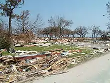 Nineteen days following the city's centennial, Hurricane Katrina struck the city on August 29, 2005, destroying almost all buildings within 500 meters (1,600 ft) of the Gulf of Mexico shoreline. Many Long Beach residents were left homeless or living in water and or wind damaged houses. At least one person was confirmed dead.[10]