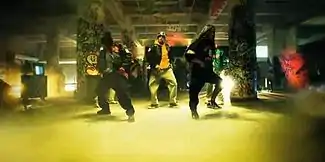 The video begins with scenes of Brown wearing a mirrored mask inside a giant birdcage, before switching to a dance routine in a smoke-filled, graffiti-covered parking garage. The mask was created for Brown by producer-collaborator Nick Marsh. In between these scenes, the video shows a Step Up-type dance-off in the parking garage.[17] When Brown raps his verse, he is seen standing next to Rhymes, wearing horn-rimmed glasses, a red Brooklyn cap, and a white baseball jersey, which was the signature look of Mars Blackmon from the 1986 film, She's Gotta Have It.[16] Rhymes then raps his verse after Brown's, standing beside him and later on the stairs in the parking garage. Wayne's verse soon follows after, with scenes of him rapping in front of the DeLorean sports car, and also on top of an ambulance car. The video also features cameo appearance from Kevin McCall, Diplo, Birdman and Mack Maine. Birdman and Maine appear when Lil Wayne is performing his verse.