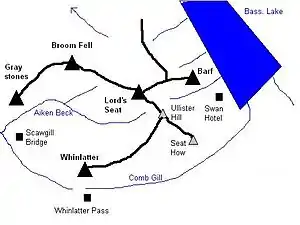 The principal feature of these fells is a ridge running from the Vale of Lorton in the west to Bassenthwaite Lake in the east. Travelling in this direction the main tops are Graystones, Broom Fell, Lord's Seat and Barf. Barf is in truth a satellite of Lord's Seat but was given the status of a separate fell by Alfred Wainwright in his influential Pictorial Guide to the Lakeland Fells[1]
