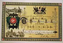 On other ceremonial occasions is worn a black silk damask robe trimmed with gold lace of a design exactly the same as that of the Lord Chancellor, known as the Entertaining Gown.[10]