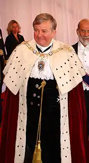 For State occasions when the monarch is present, the Lord Mayor wears a crimson velvet robe of state trimmed with an ermine cape and facings, very similar to a royal earl's coronation robe. It is tied with gold cordons, and dates from the reign of George IV.[10]