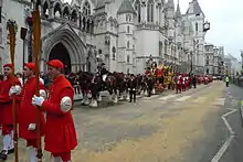 The day after being sworn into office, the Lord Mayor leads a procession from the City of London to the Royal Courts of Justice in the City of Westminster, where the Lord Mayor swears allegiance to the Crown. This pageantry has evolved into one of London's longest-running and most popular annual events, known as the "Lord Mayor's Show". The Lord Mayor travels in the City's state coach that was built in 1757 at a cost of £1,065.0s.3d. Nowadays, this festival combines traditional British pageantry with the element of carnival,[6] and since 1959 it has been held on the second Saturday in November. Participants include the livery companies, bands and members of the military, charities and schools. In the evening, a fireworks display is held.