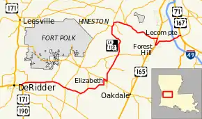 | Forest Hill | 71.3 | 114.7 | West end of LA 497 concurrency | ||