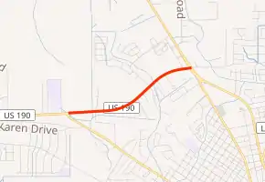 A decade later, in October 1967, construction began on the segment extending west from LA 25.[1] This segment was designated as LA 3114 and was opened to traffic in January 1969.[1] Two years later, it became the new routing of U.S. 190, and the old alignment through town became U.S. 190 Business. With this change, the LA 3114 designation was dropped, and LA 25 was truncated to its current terminus at U.S. 190 on the north side of Covington.