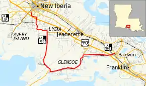 From the west, LA 83 begins at a junction with LA 14 (Center Street) at the southwestern edge of the city of New Iberia. The route heads southward on Weeks Island Road and has access to two consecutive exits on US 90, the first being via Parish Road 605 (South Lewis Street), connecting with Lafayette and Morgan City. After the surroundings transition to rural farmland, LA 83 makes a zig zag through the community of Lydia and intersects LA 85, which leads to Patoutville and Jeanerette. Resuming its southward course, LA 83 traverses a remote stretch of wetlands, which includes a swing bridge across Bayou Patout, before crossing a salt dome known as Weeks Island.[2][3][4]