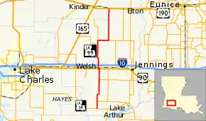 The highway bisects the sparsely populated Jefferson Davis Parish as it zigzags along rural section line roads. Roughly halfway along its route, LA 99 passes through the town of Welsh and an interchange with Interstate 10 (I-10), the region's main east–west highway. It also intersects US 90, an older parallel corridor that now acts largely as a business route in the area.